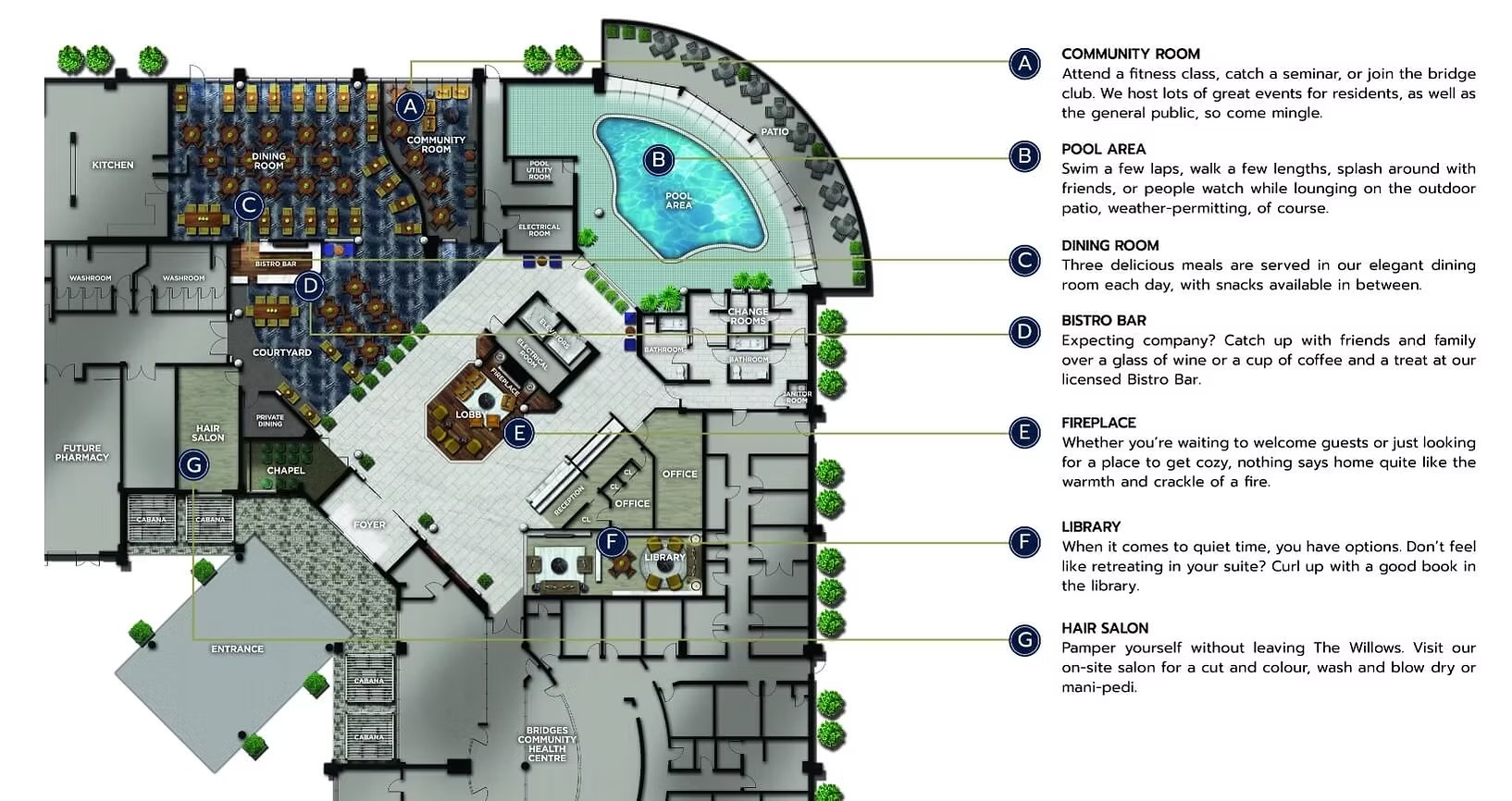 The Windsor celebrates active living with an exceptional collection of on-site amenities designed for your enrichment and convenience. Discover endless possibilities without stepping outside your home, from rejuvenating wellness services to exciting social experiences.